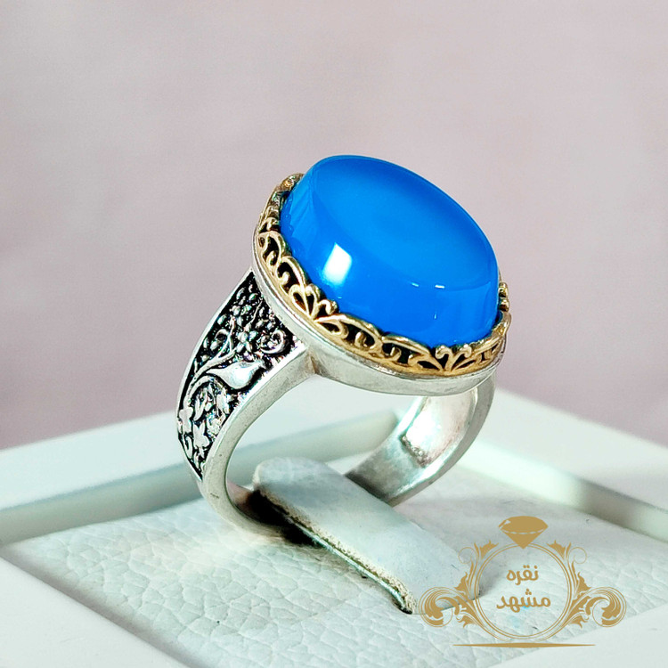 انگشتر مردانه عقیق ابی طرح پرنده تاج طلایی